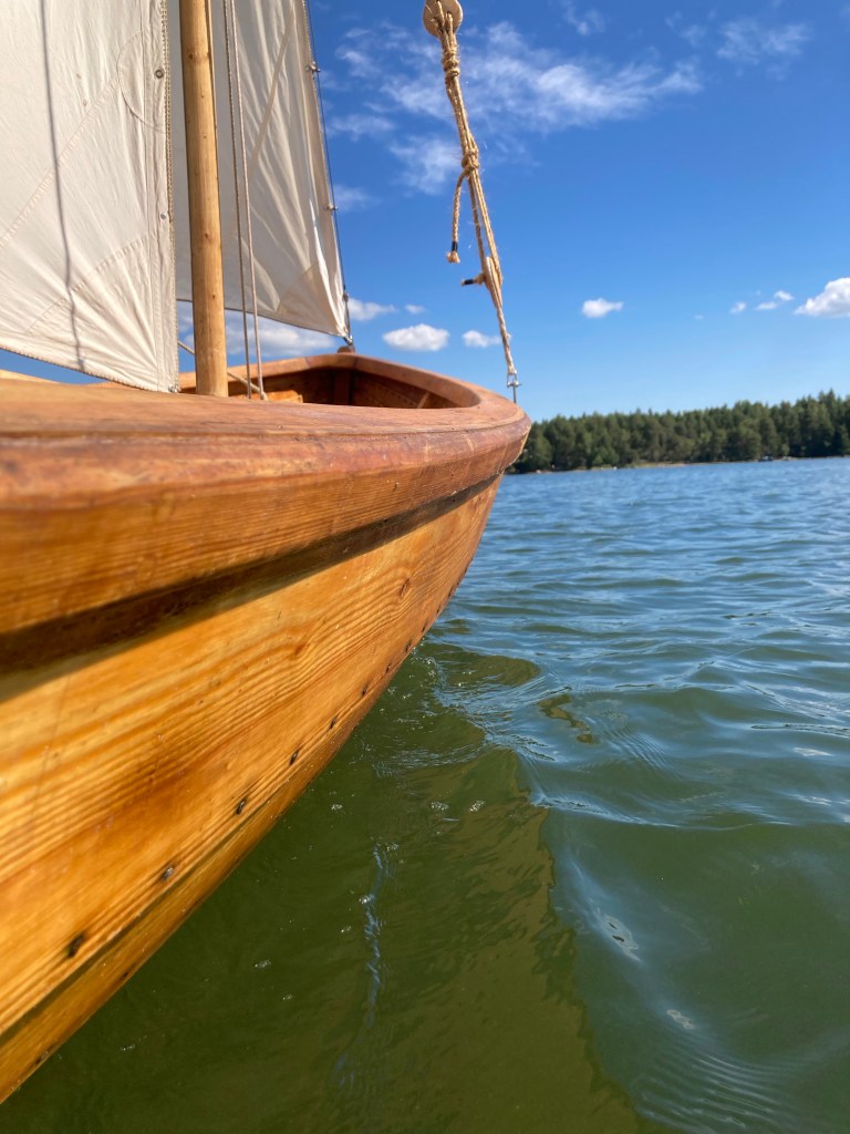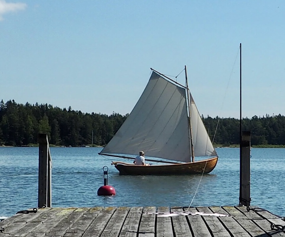 Det går undan. Bommen kommer så lågt att det känns som att segla Starbåt vid stagvändningarna. Den lilla allmogejullen blir kännspak i denna skärgård där dylika inte är lika allmänt förekommande som i Korpotrakten t.ex.