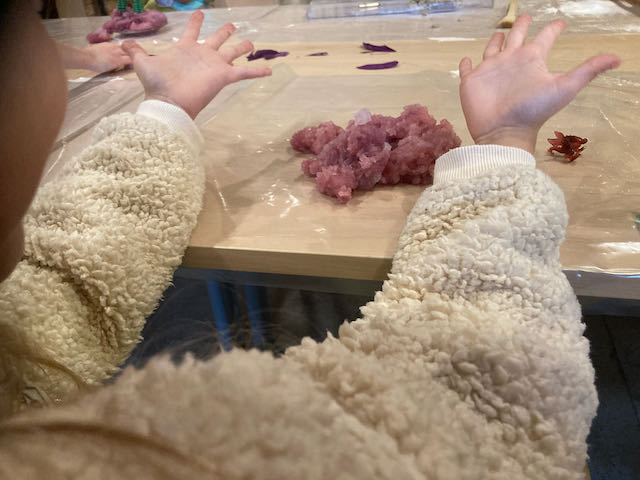Konstkursen fortsätter också. Denna dag bekantar eleverna sig med olika material och ytor. Barnbarnet verkar nöjd. Särskilt gillar hon att röra om med händerna i salt.