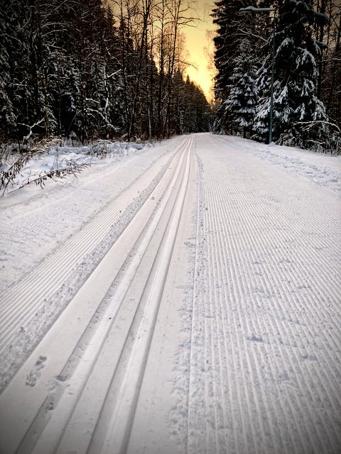 Det har kommit snö. Tillräckligt för att kunna dra spår i Esbo Centralpark. Men bara delvis. På vissa ställen är det bara utjämnat, på andra ställen har spåren bildats genom att folk har skidat där. Hur som helst är underlaget för det mesta lämpat för fristil, skate. Genom att snön är mjuk blir farten inte hisnande. Dessutom är konditionen och tekniken inte den bästa i detta skede av säsongen. Det har lovats värmegrader till helgen, så det gäller att ta ut svängarna så länge det går.