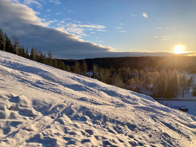 Mot kvällen kommer solen fram och lyser upp tillvaron. Efter några åk tar pensionären paus och äter fisksoppa i stugan. Ännu ett åk innan banan tas bort och åkarna beger sig hemåt. Knäna har fått sig en omgång igen. Samma helg åks FM för masters i Tahko. Det är första gången på länge han inte deltar. Men detsamma gäller flera av hans tidigare medtävlare. Han konstaterar efter en titt på resultatlistan att där nog hade funnits medaljer att hämta. Det var bara Reijo som var överlägsen, de andra har han nog brukat besegra. Men i år blev det så här.