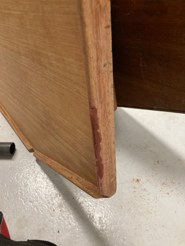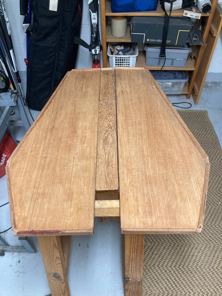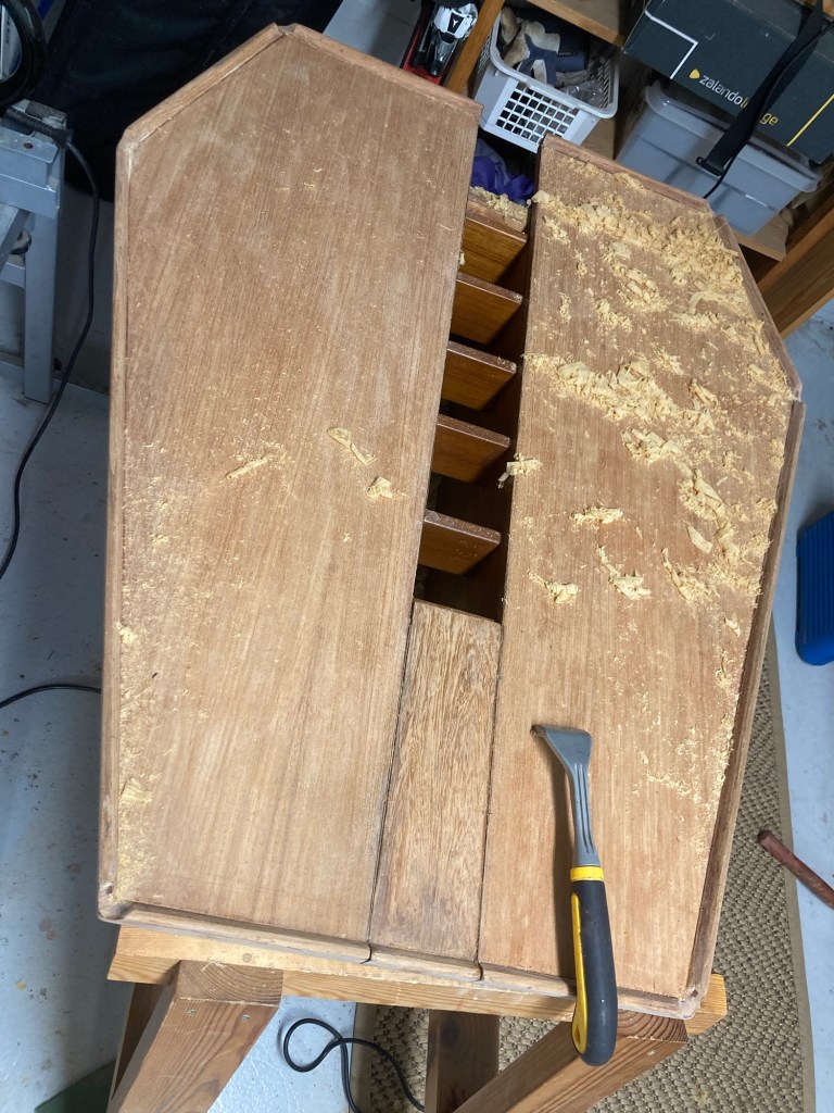 Frågan är hur det skall behandlas. Det är tydligen lackat, inte oljat. Han börjar slipa men tar sedan hetluftsblåsaren och stämjärnet för att avlägsna allt lack.