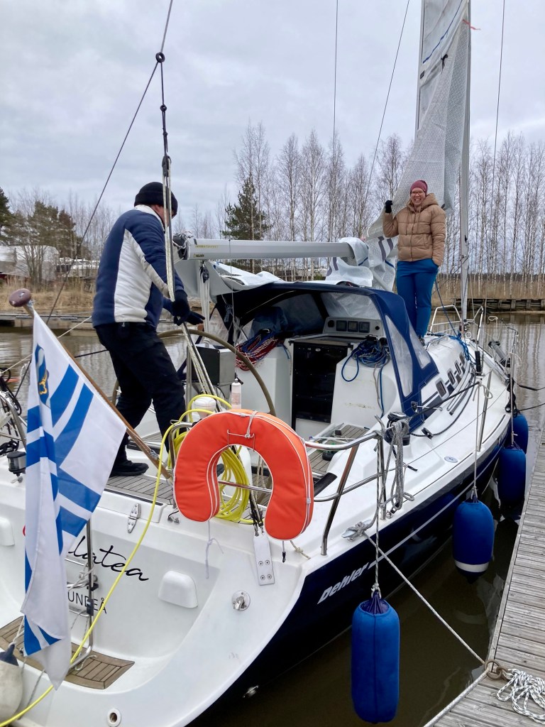Familjen Frilund har redan sin båt i sjön. Återstår att se om de verkligen tänker bege sig ut på årets första seglats trots att rapporterna utlovar köld och snö. Själv åker han hem och ställer in bilen i det varma garaget.