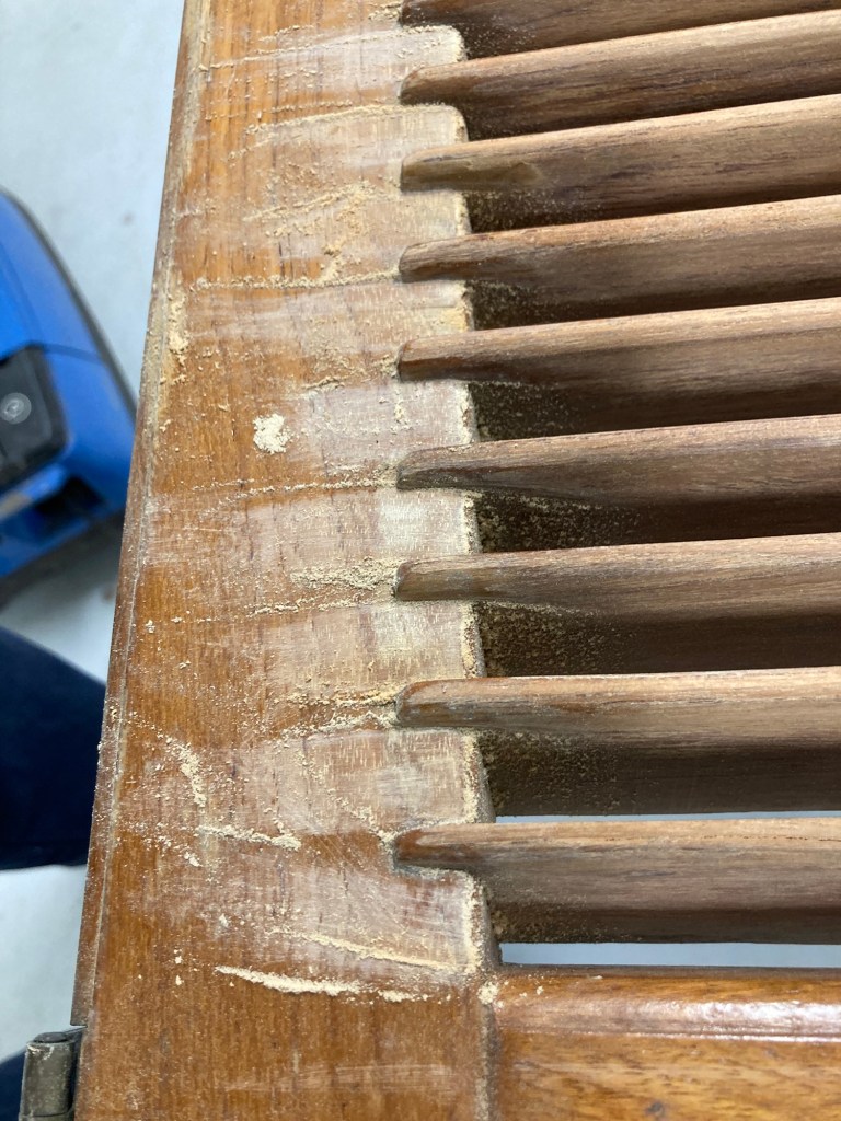 I garaget fortsätter slipandet av dörren. Det är besvärligt att komma åt alla mellanrum. Lappade ställen förstärks med epoxy.