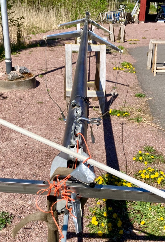 Spridare, vanter och barduner fästs vid masten och rorkulten tas hem för att slipas, limmas och senare lackas. Hannu är på plats för att jobba med motorn och det elektriska. Den gamla värmaren kastas ut. Motorfästena får inte godkänt.