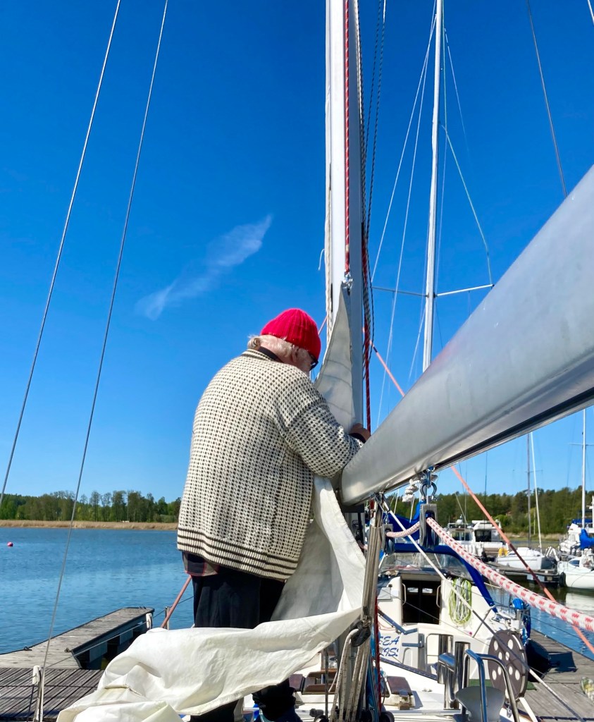 Följande dag har Hannu igen förskansat sig ombord och signalerar att han vill ha arbetsro genom att ha radion på så hög volym att det inte går att tala med honom. Den presumtiva seglaren förstår vinken och eftersom arbetet på riggen är färdigt flanerar han på bryggan. Kari behöver tydligen hjälp med att skära i storseglet.