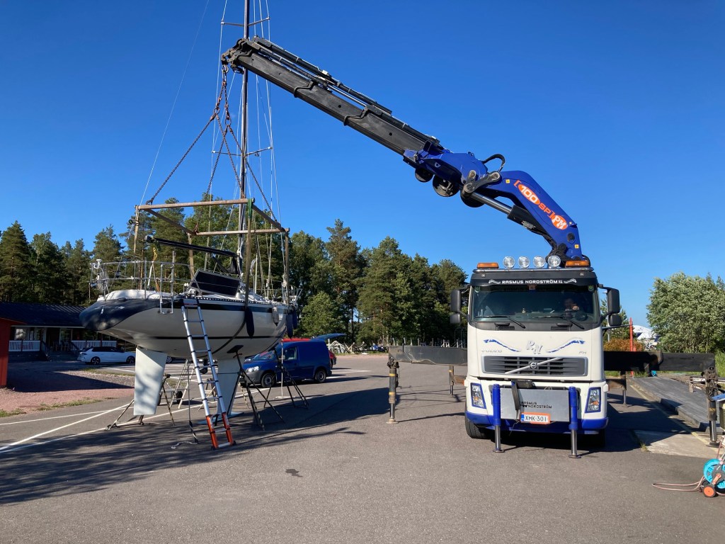Det är inte lätt att hålla reda på alla vanter, stag och skot som är fästa vid masten. Något kan alltid gå fel och så går det även nu. Men mera om det senare. Nordström kommer med kranbilen i god tid, innan besättningen hunnit reda upp alla linor och kasta i sig en lunch på ABC.