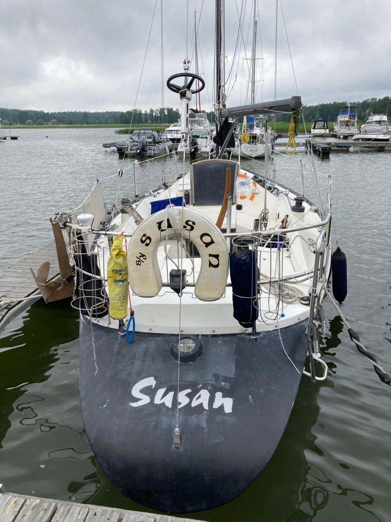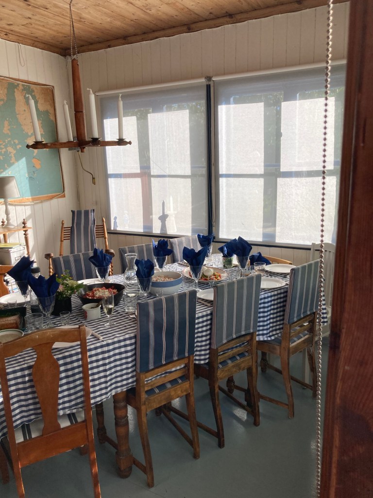 Pärlan är lackad men är inte riktigt klibbfri ännu. Det besluts att midsommarafton detta år inte skall firas i båtskjulet utan på kusinhusets veranda.