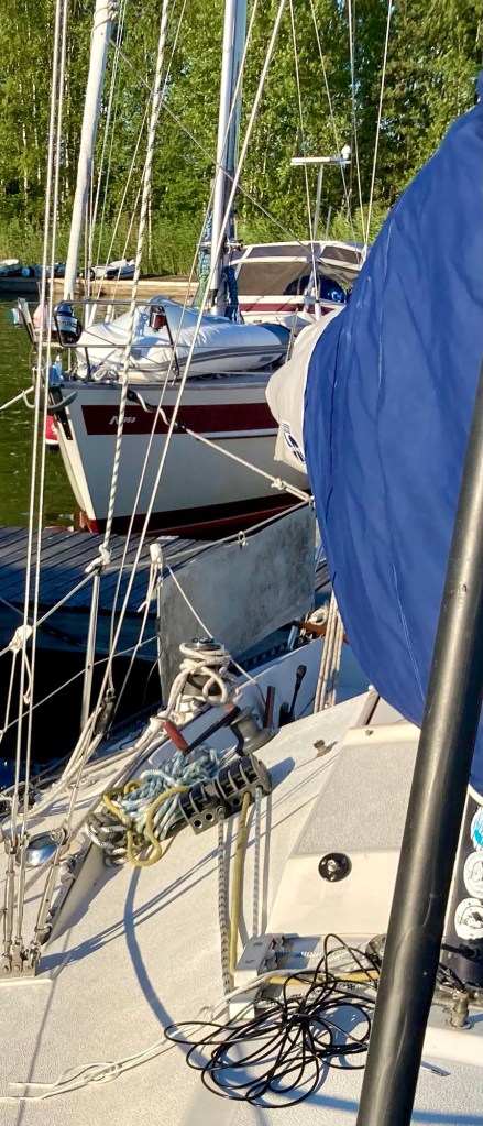 Ett stort framsteg är att seglen kan skäras i. Systemet med lazy-Jacks är svårare att få att fungera. Till slut monteras uttaget för VHF-antennen.