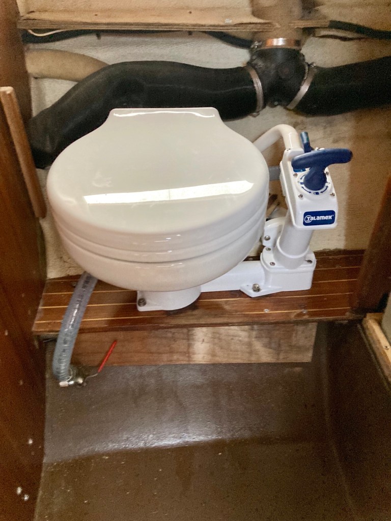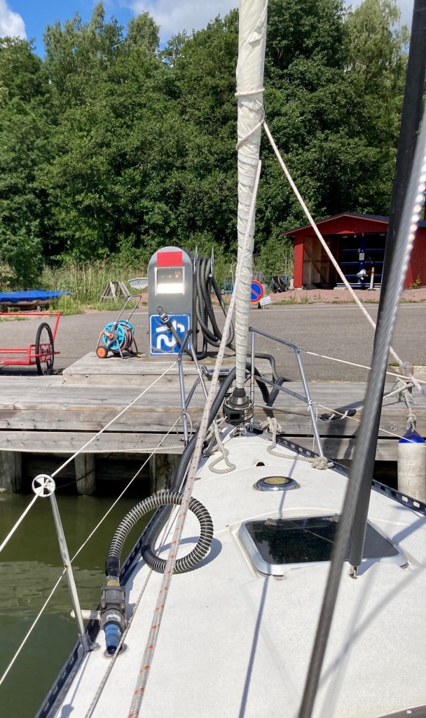 Det går bra, han lägger till vid tömningspunkten. Det visar sig att tanken är full, en massa avföring sugs igenom slangen en längre tid. När den är tömd kör han tillbaka till båtens plats.