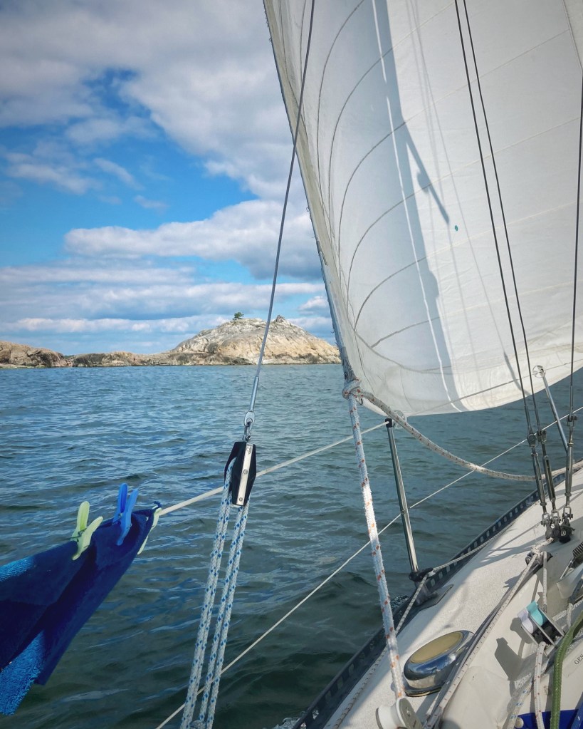 Det blåser så mycket att han kan segla till inloppet till Barösund där han startar motorn och tar ned seglen.
