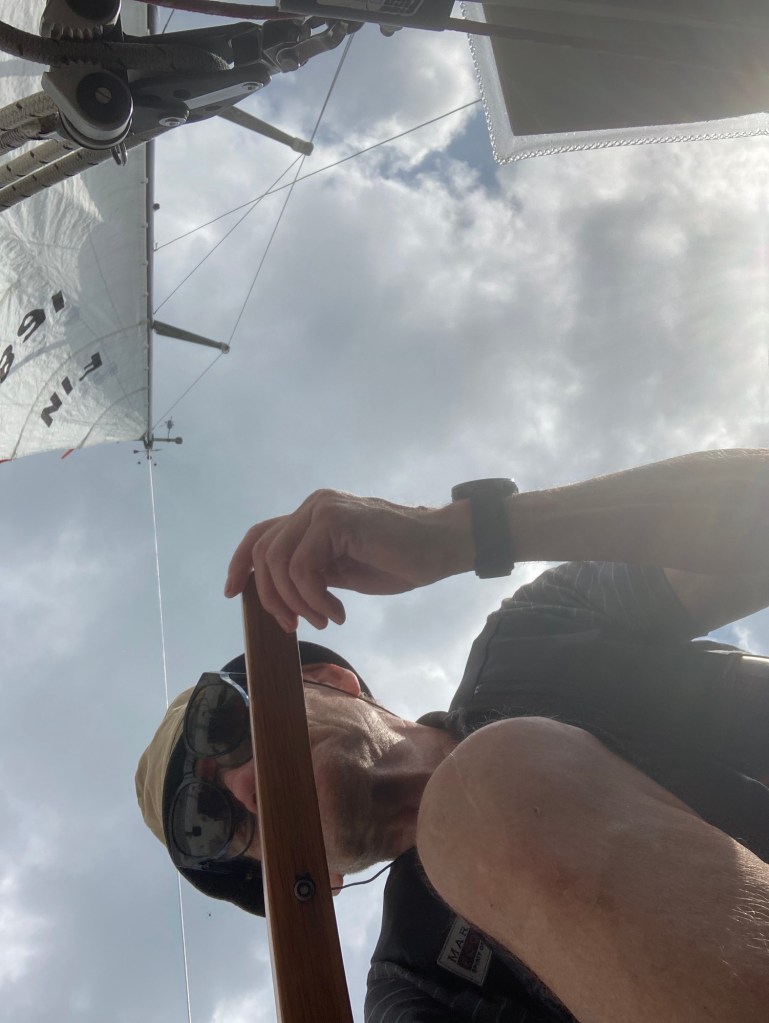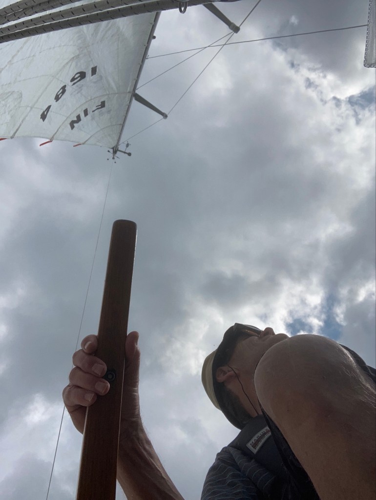Tisdagen är fin och han åker till hamnen. Fortsatt förberedelse föregår avfärden som sker för motor. En lätt bris kan skönjas, det föranleder segelhissning. Motorn stryps. Nu seglar han själv, solo, ensam. Vem skulle ha trott att han skulle få uppleva detta igen!