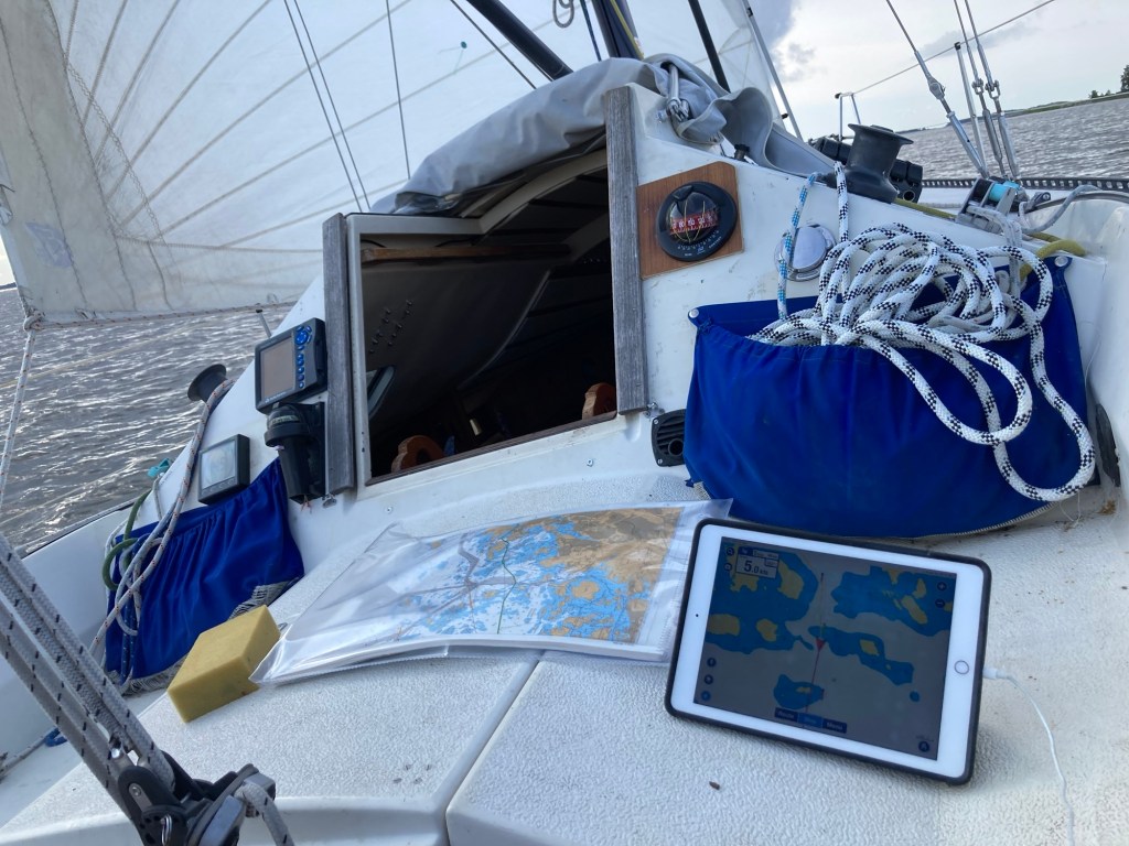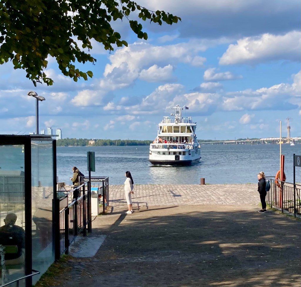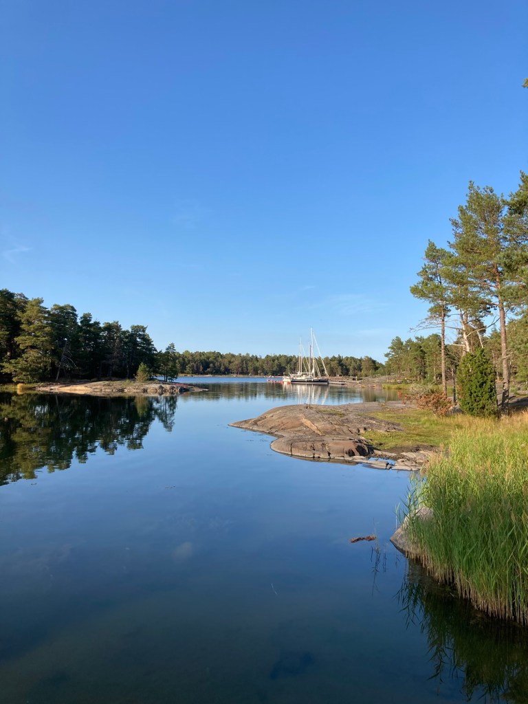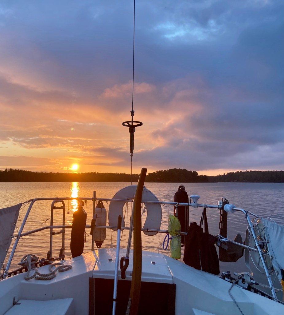 Han åker in mellan Sandhamn och Kungsholmen och stryker segel efter det.