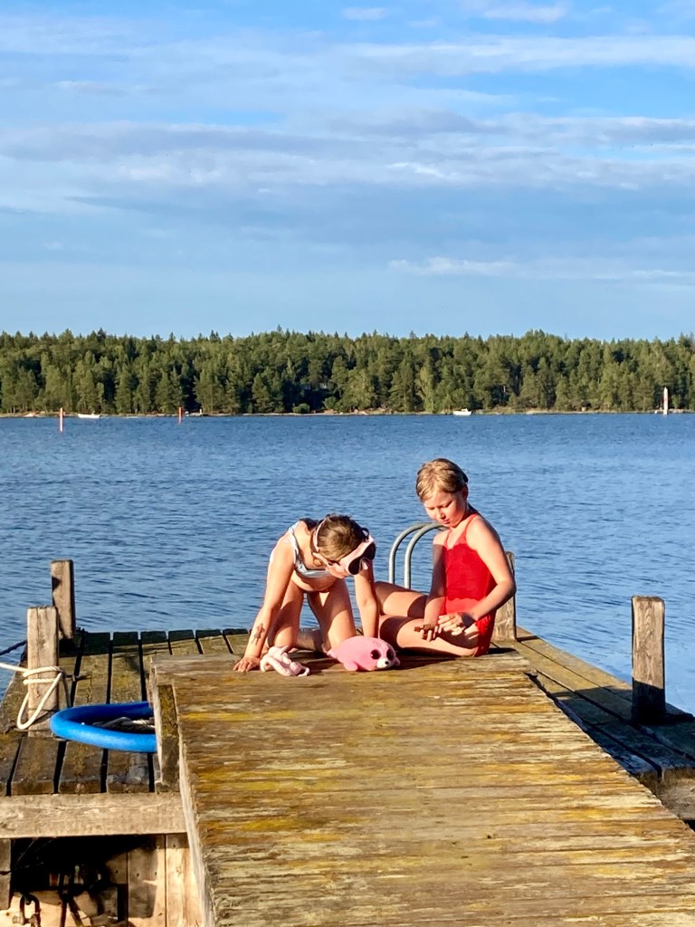 Alva och Sofia uppför ett skådespel på bastubryggan inför en begeistrad publik.