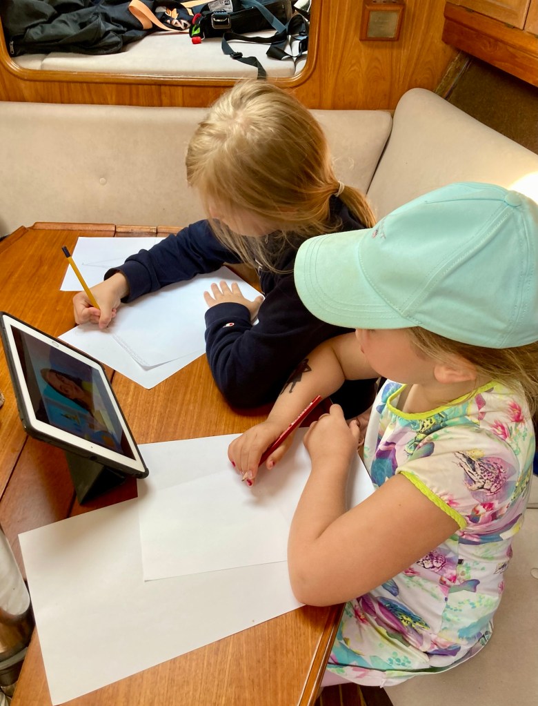 Småflickorna dröjer längre, de skapar flitigt konstverk av varierande slag medan de ser på Youtube. Farfar underhåller med gitarr.