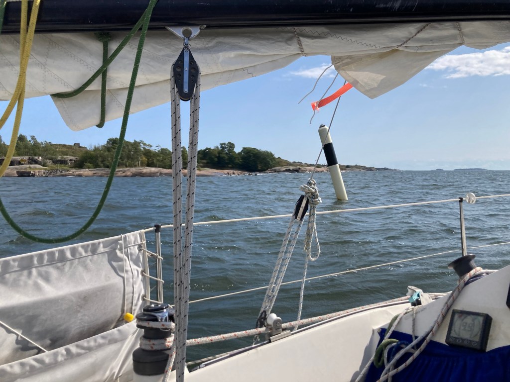 Till att börja med är vinden svag, men tilltar i styrka ju närmare Helsingfors han kommer. Norr om Mjölö visar vindmätaren 8-10 m/s, det börjar bli obekvämt för en ensamseglare med fulla dukar. Han rullar in genuan något och gången blir säkrare. Storen får vara, han bryr sig inte om att gå upp på däck för att reva.