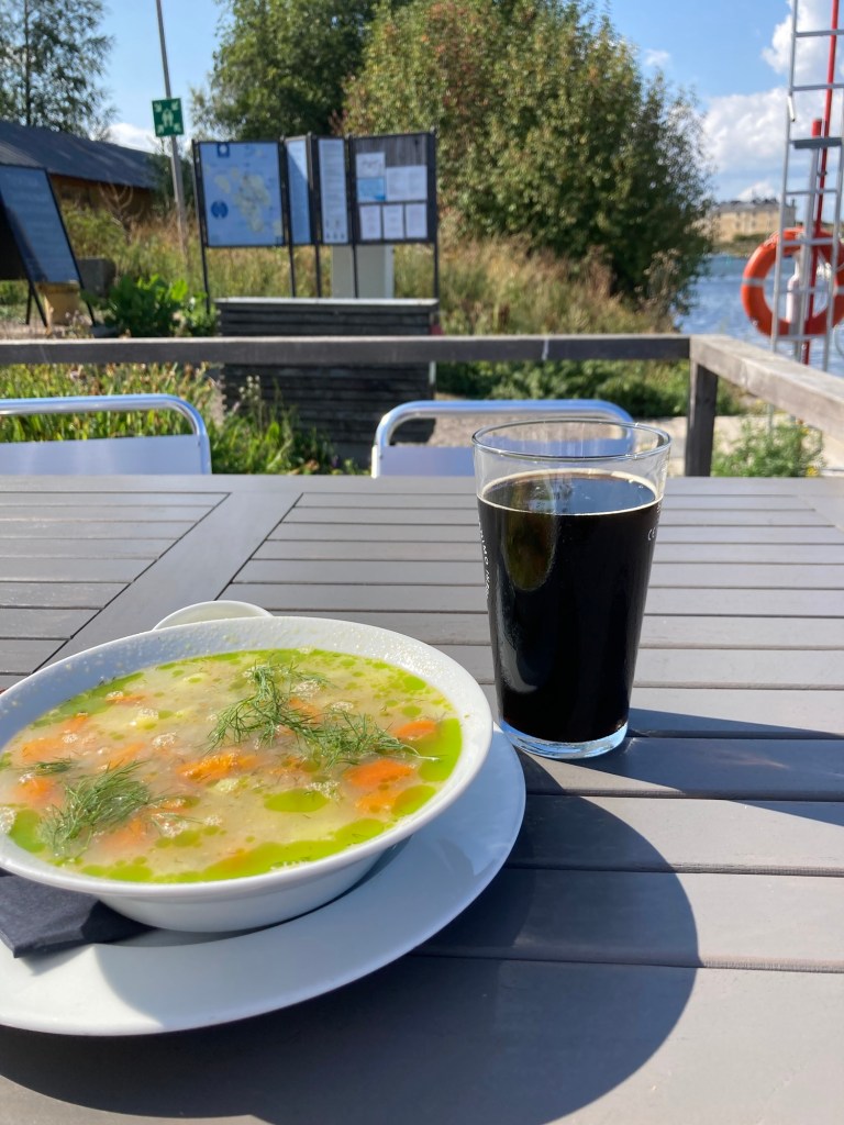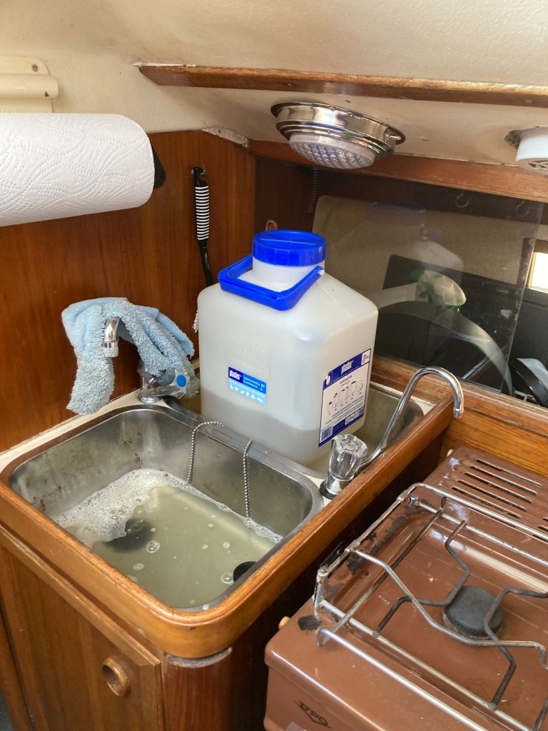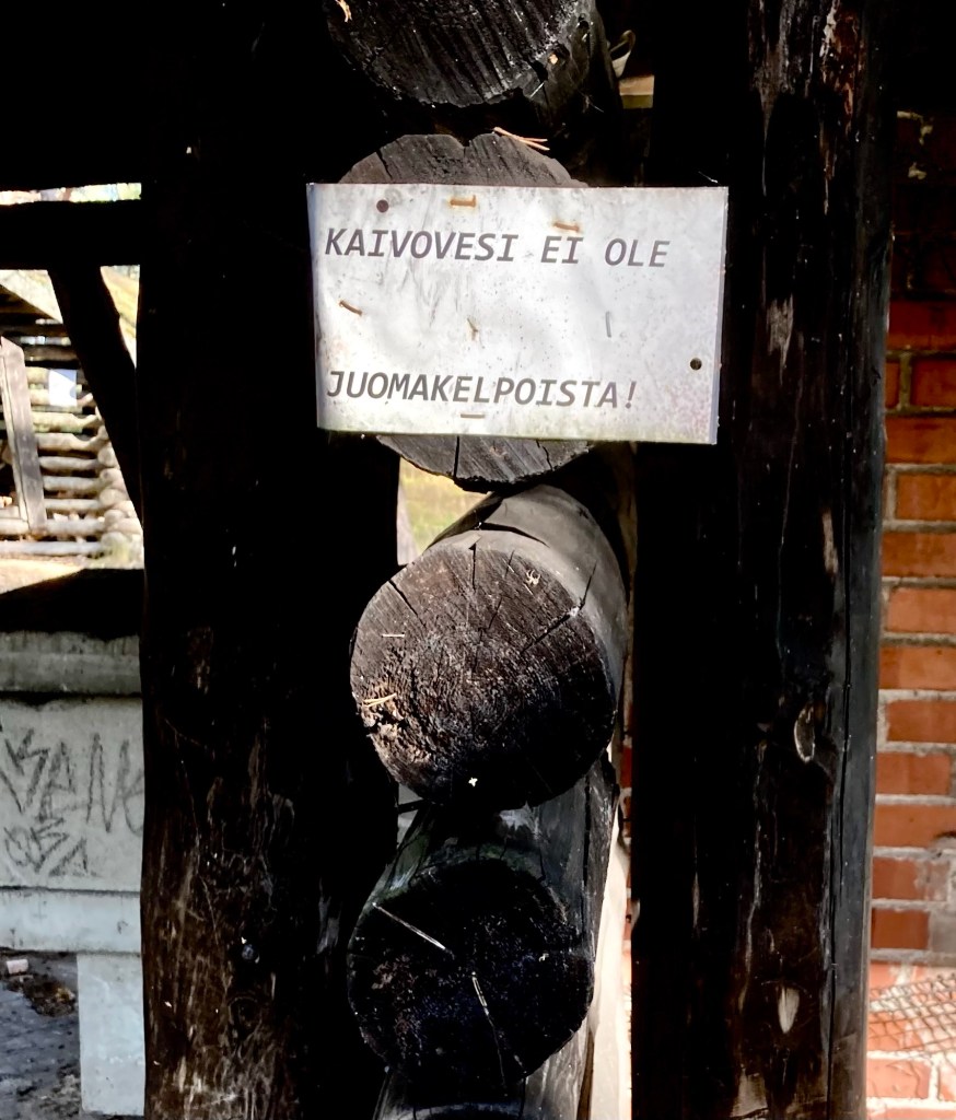 Texten på finska upplyser att vattnet inte är drickbart. Men till diskvatten må det väl duga, resonerar han och för kärlet till båten. Lyckligtvis är ölen inte slut ännu och i termosen finns så pass mycket vatten att det räcker till morgonkaffet.