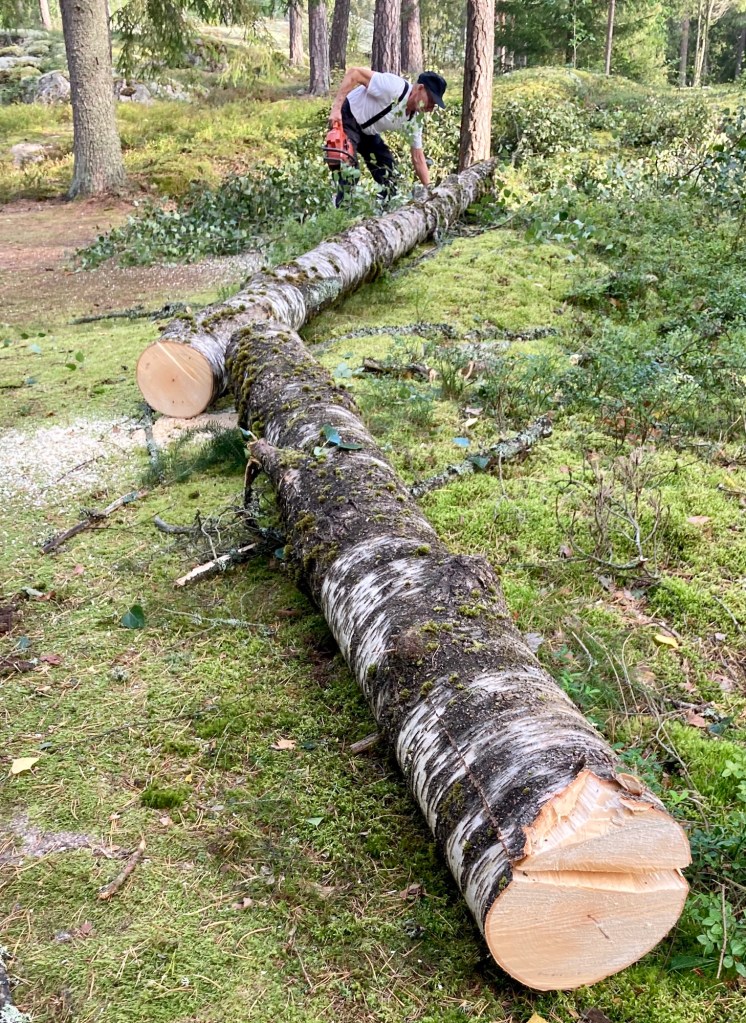 På en dryg timme är björken fälld, sågad i bitar och riset bortfört. Klabbningen får bli till senare.