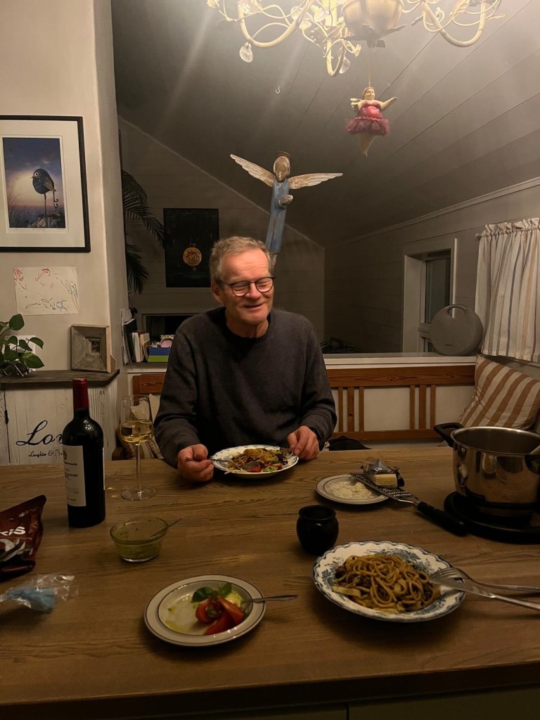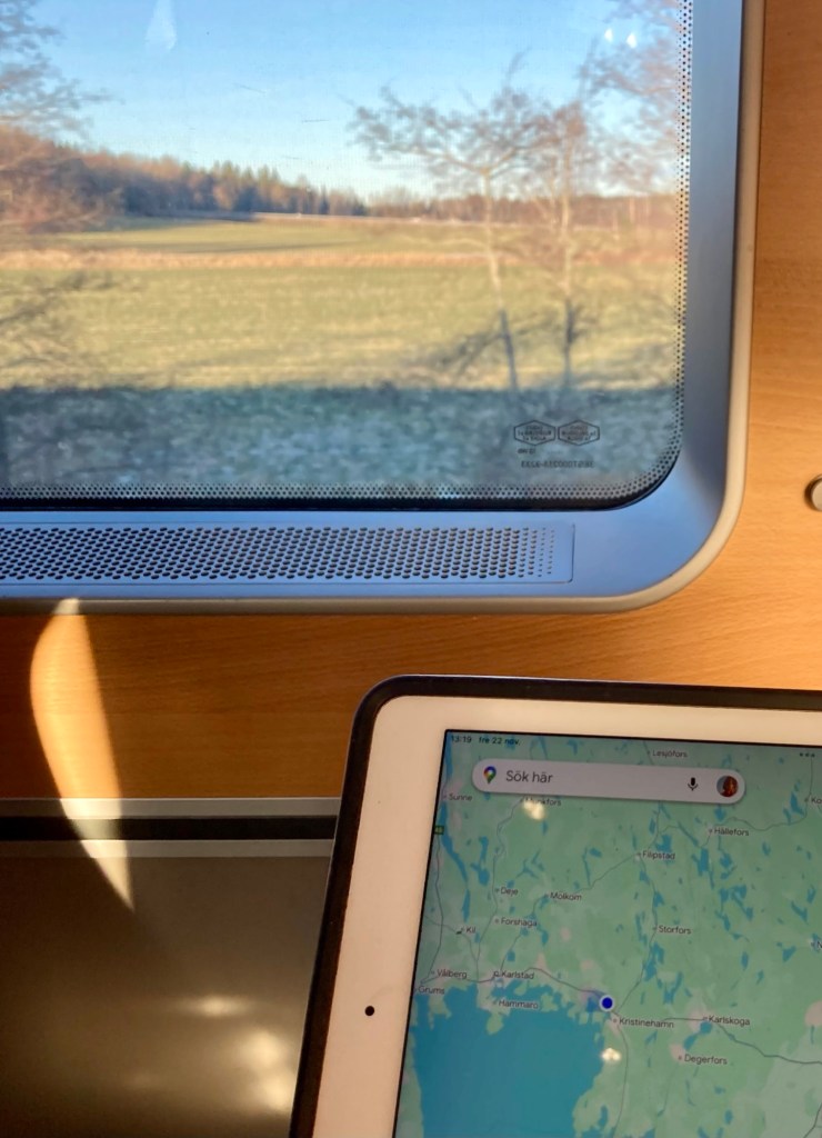 Tåget är tjugo minuter försenat, men följande tog från Oslo mot Skoppum är lika mycket sent så han hinner bra. Tydligen fungerar inte tågen i de nordiska länderna när vintern kommer.
