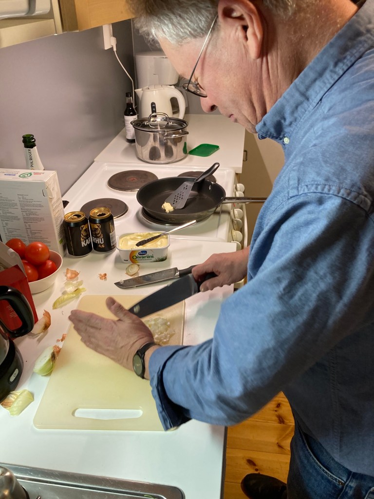 Rolle tillreder middagsmat efter bastun. Förhållandena skulle vara idealiska om hälsan skulle vara bättre.