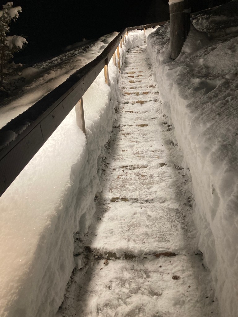 Nästa dag är hälsan bättre. Det blir en 15 kilometers skidlänk i snöväder och därpå snöarbete på gården, bl.a framtagande av bastutrapporna.