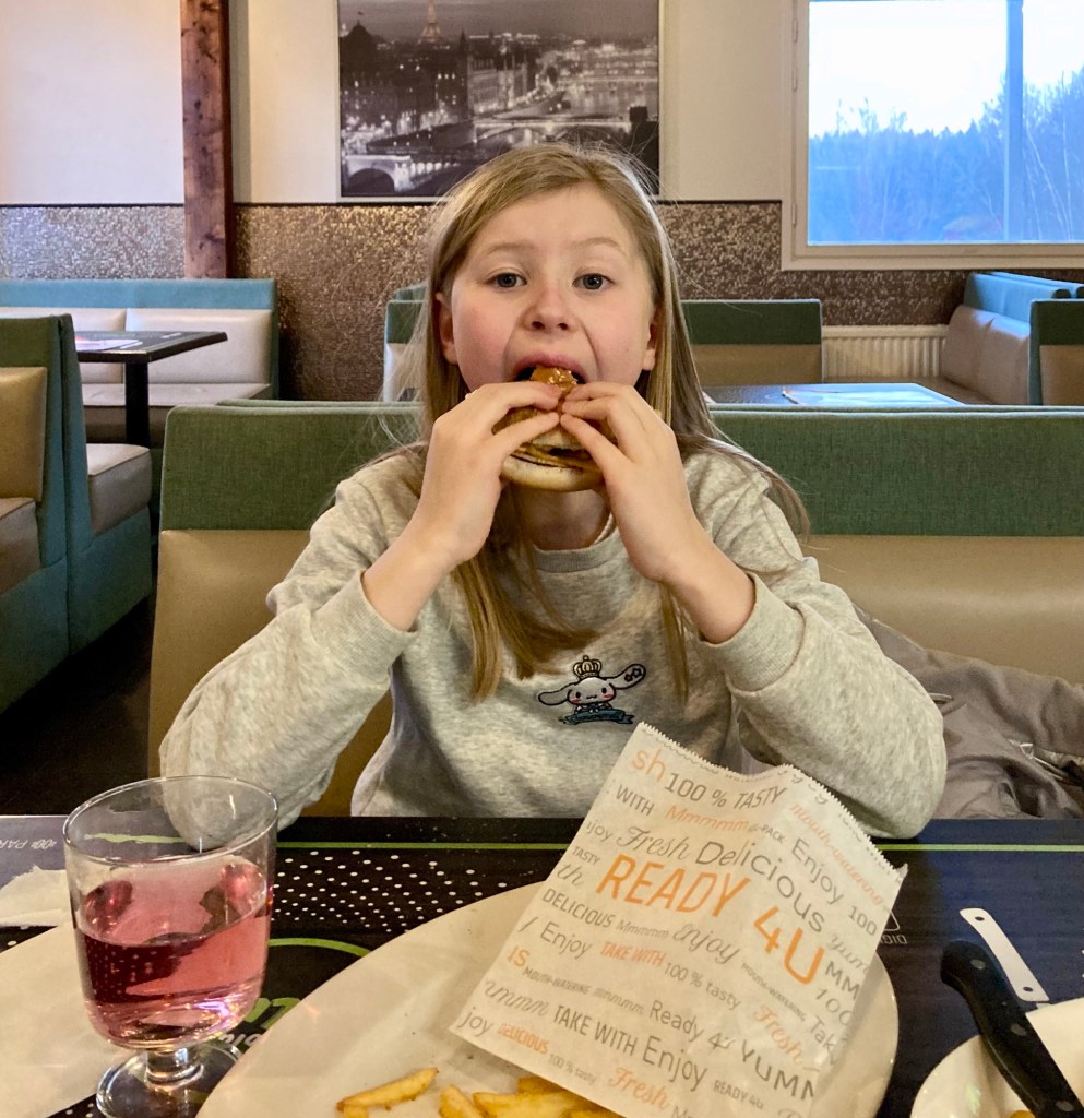 Middag intas på La Luna, ett grillställe på vägen till backen. Av misstag fick de dubbel ranson franskisar.