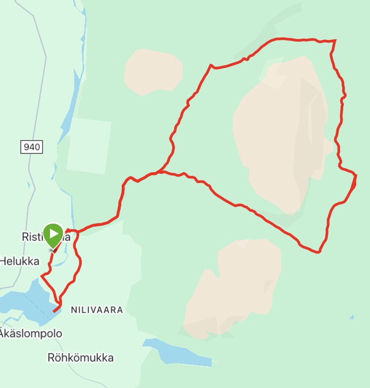 Det har varit kallt på natten igen och spåren är hårda, men tyvärr blåser det hårt vilket gör att grenar, bark och mossa samlas i dem. Det är oftast förnuftigare att åka mellan spåren. Det blir improvisation igen, han åker först ned mot Äkäslompolo, sedan upp till Kotamaja, därifrån till Karhukota.