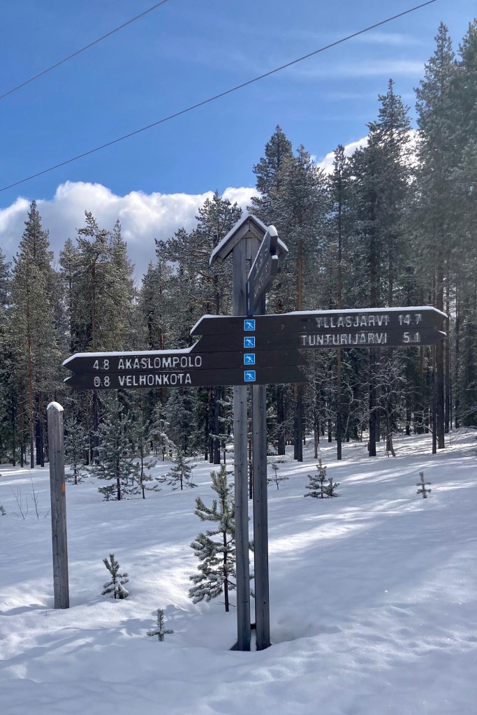 Det snöar sakta hela natten och på morgonen tittar solen fram. Idealiskt väder alltså! Han skidar ner till Äkäslompolo och fortsätter därifrån mot Velhonkota. När han kommer dit är klockan ännu så lite att han inte törs ta paus utan fortsätter mot Tunturijärvi.