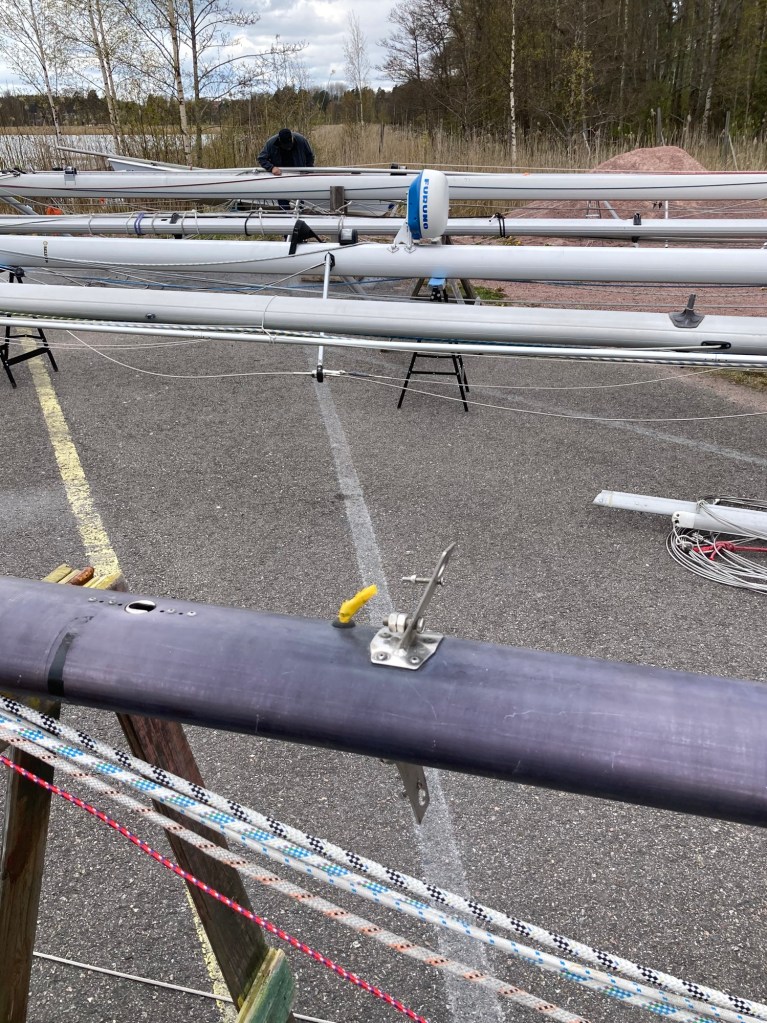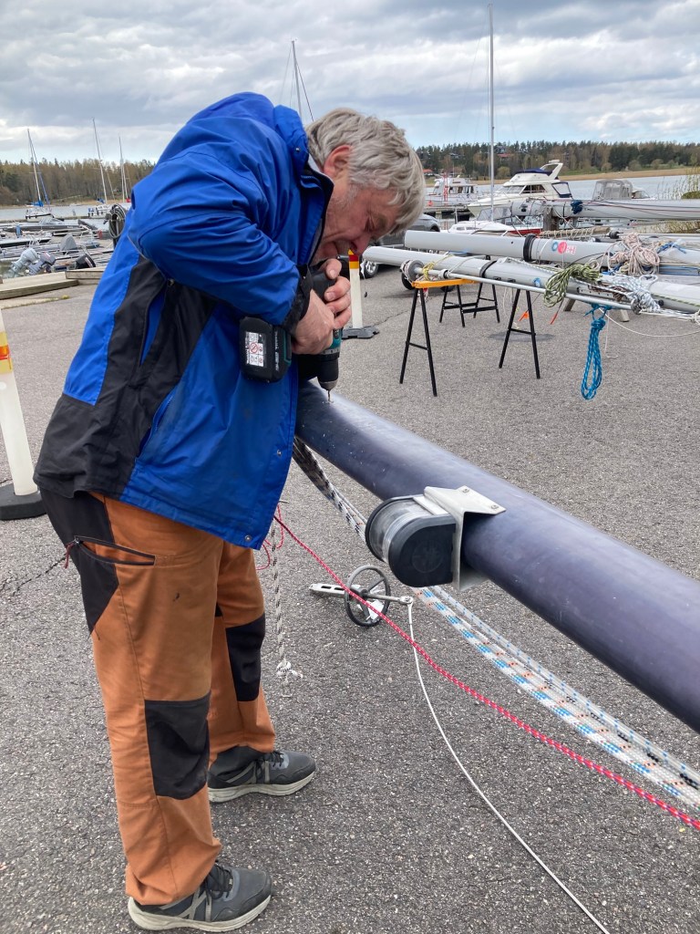 Masterna är framtagna. De lyckas skära i spinnakerbommens upphalare. Håkke fäster en extra knape för fästning av densamma.