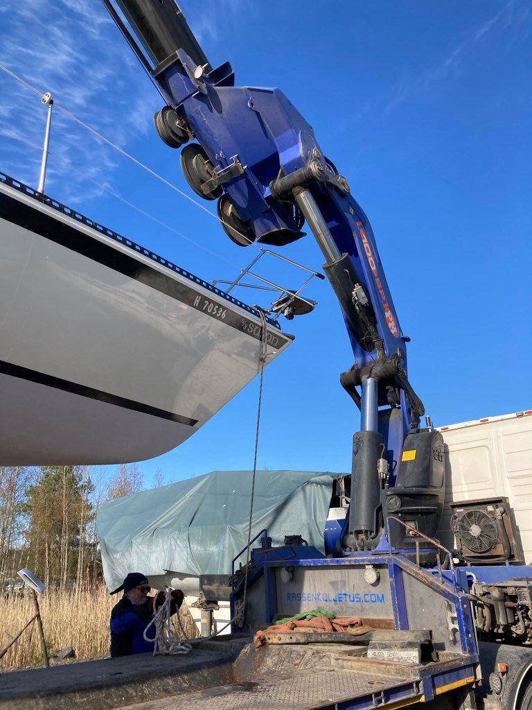 Proceduren går relativt smärtfritt, inom en halv timme är hon i sitt rätta element och masten stagas omgående. Av någon orsak har ett stag krympt så att vantskruven inte går att spänna så mycket att sprintarna kunde anbringas. Med Håkkes hjälp tar sig seglaren upp i masten för att se om något trassel kunde skönjas, men något sådant ser han inte. Så det blir ändå en tur till Motonet för att inhandla en längre vantskruv. Samtidigt återlämnar han radarreflektorn som Håkke bett honom köpa innan han insåg att en sådan redan finns i akterstaget.