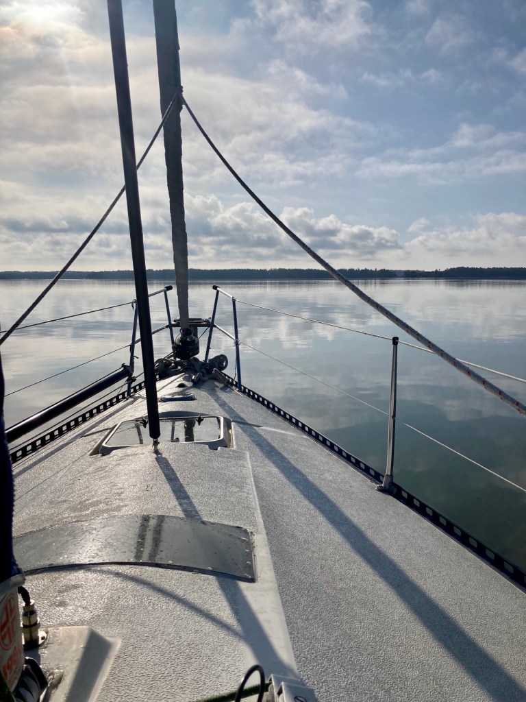 Havet ligger blankt. Utanför Kalvö får han bottenkänning men kommer loss.