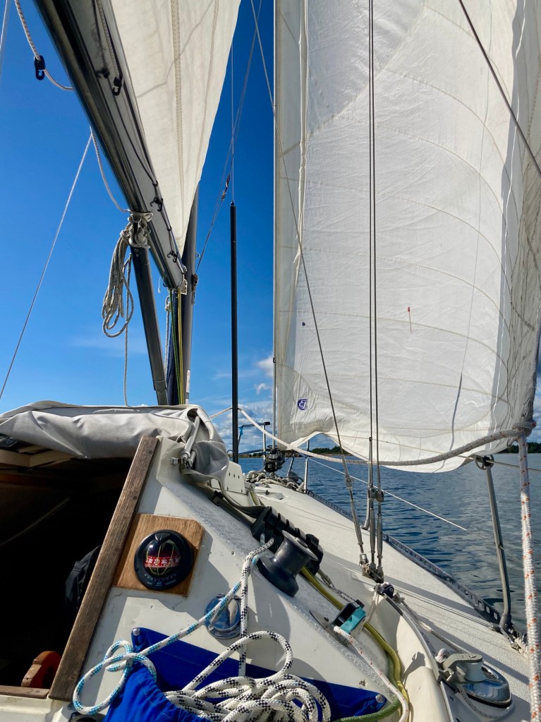 Det blir i varje fall en fantastisk kryss i lätt vind, 2-4 m/s. Han reflekterar att han kanske njuter mest av kryss om han har tid. Man måste vara på alerten hela tiden och vara aktiv. När han kommer till Stora Halsö är där bara motorbåtar, men han blir vänligt emottagen.