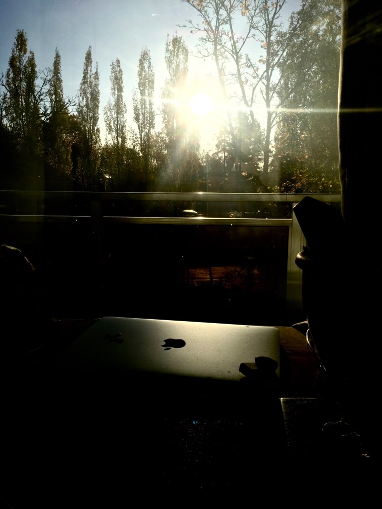 Tömd på uppslag. Sätter sig med paddan vid skrivbordet medan höstsolen sänder sina strålar genom rutan och bländar honom. Arbetsplatsen är inte tillgänglig förrän på eftermiddagen under soliga dagar. Han vänder sig med ryggen mot fönstret. Men inga idéer föds.