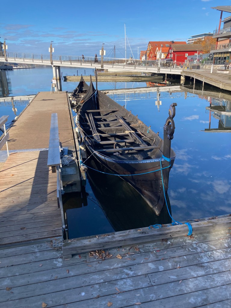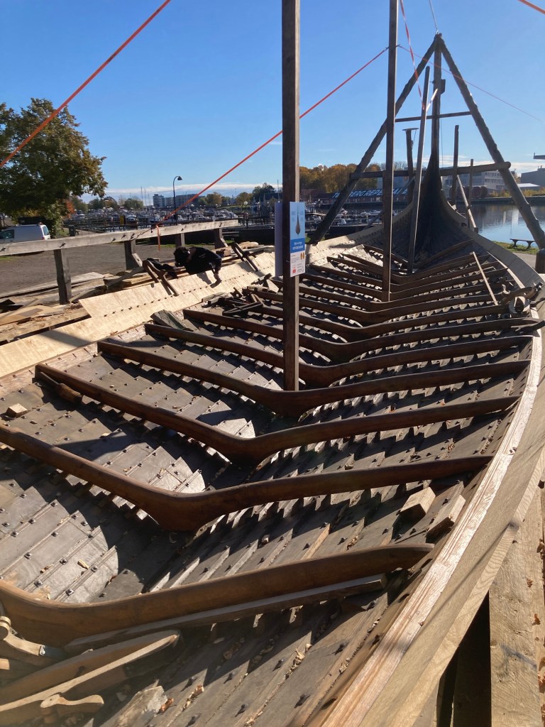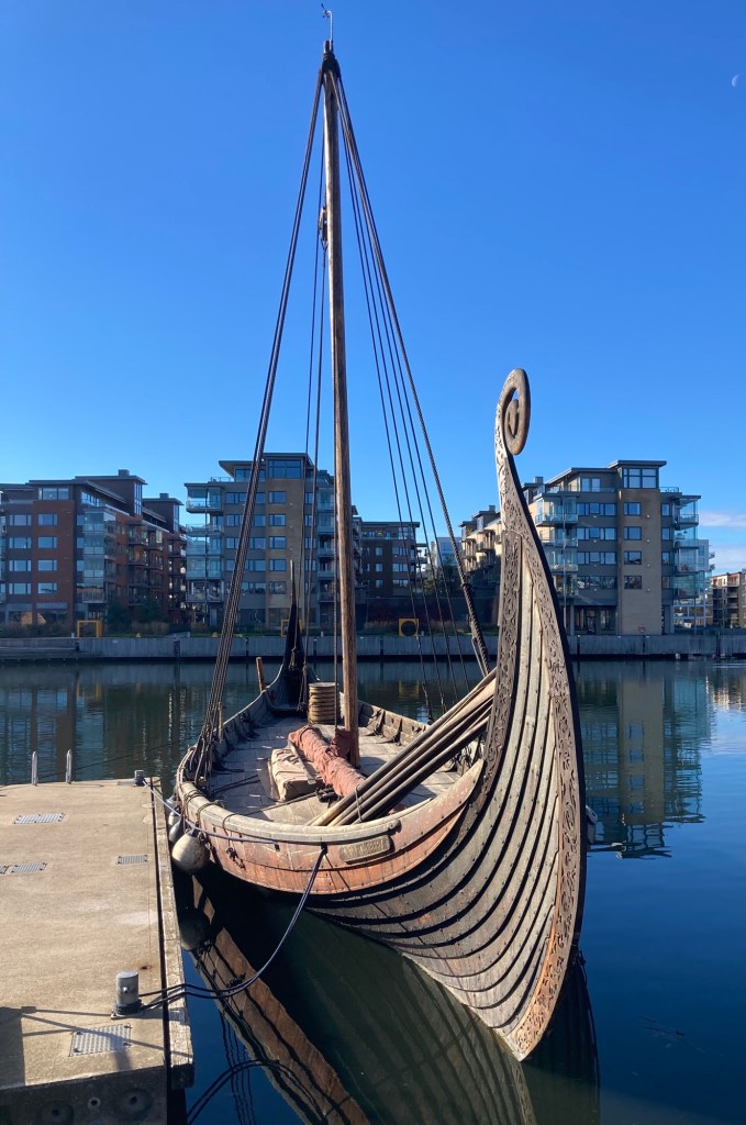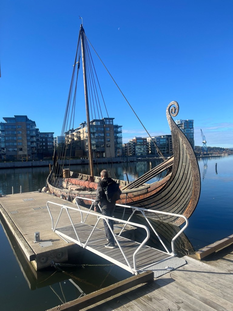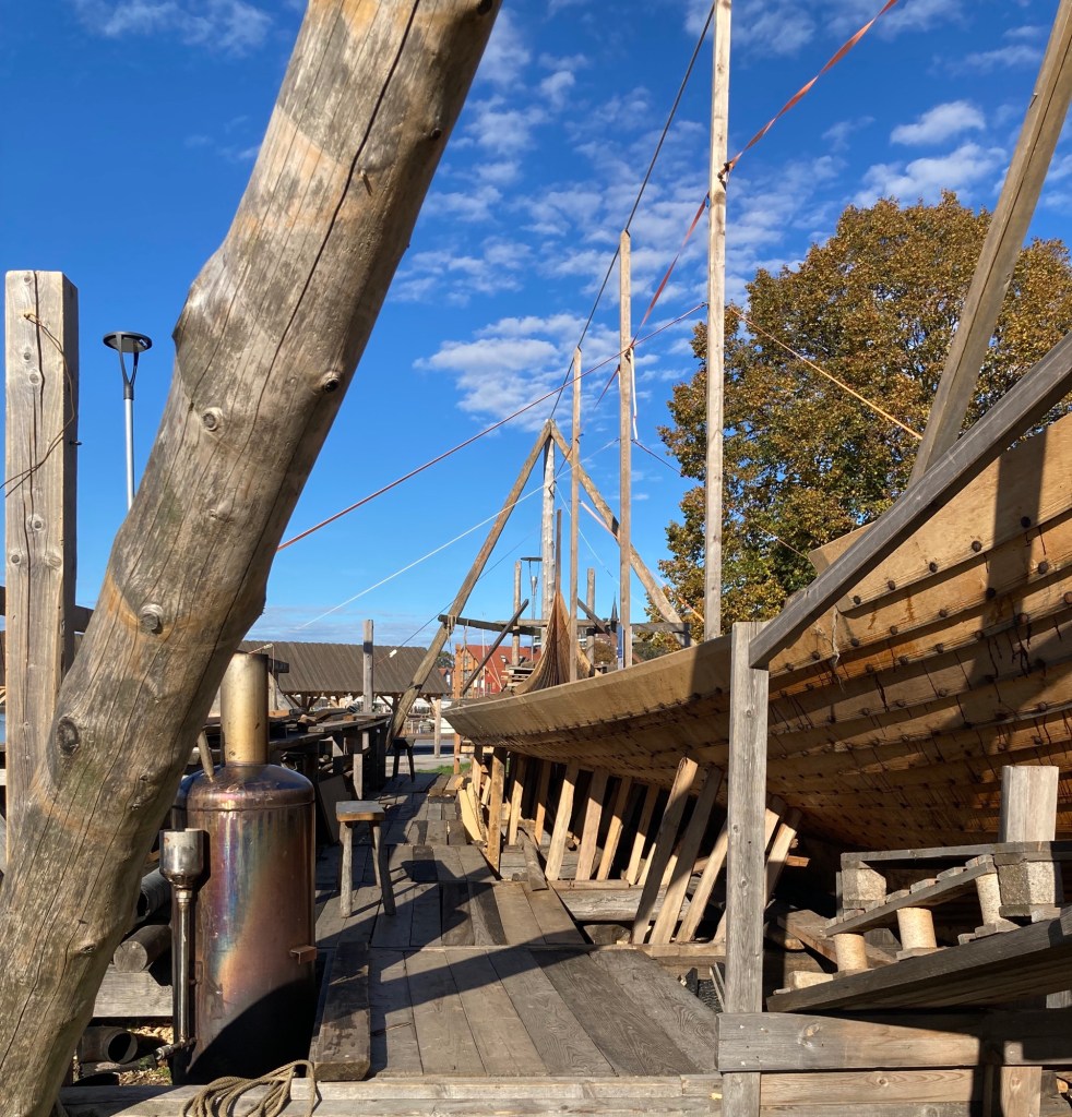 Farfar fick beundra vikingaskepp vid bryggan. En kopia av Osebergsskeppet är under konstruktion.