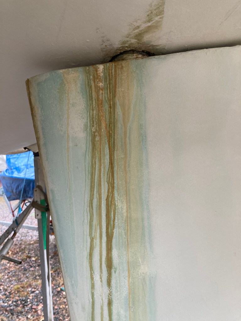 Varför rodret ser ut så här vet han inte. Något har runnit ner längs med roderstocken. Den gröna färgen uppträder också längs vattenlinjen. Märkligt.