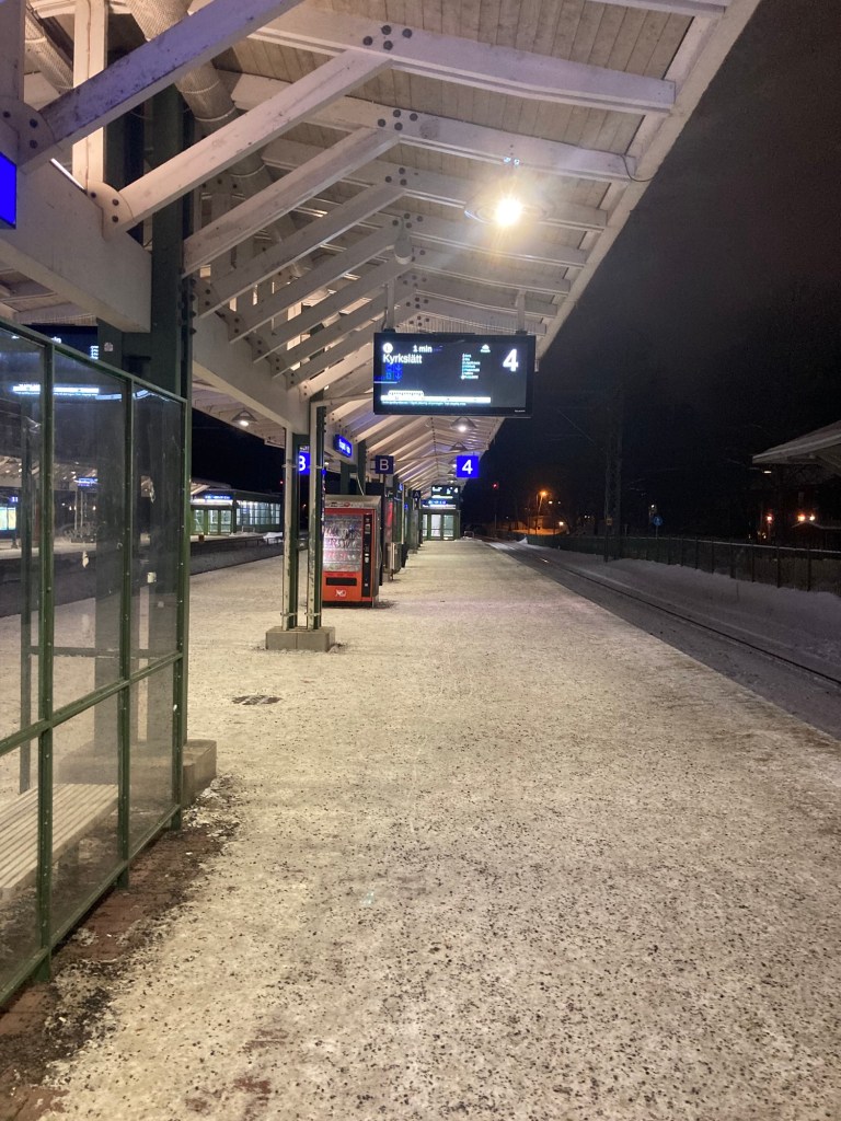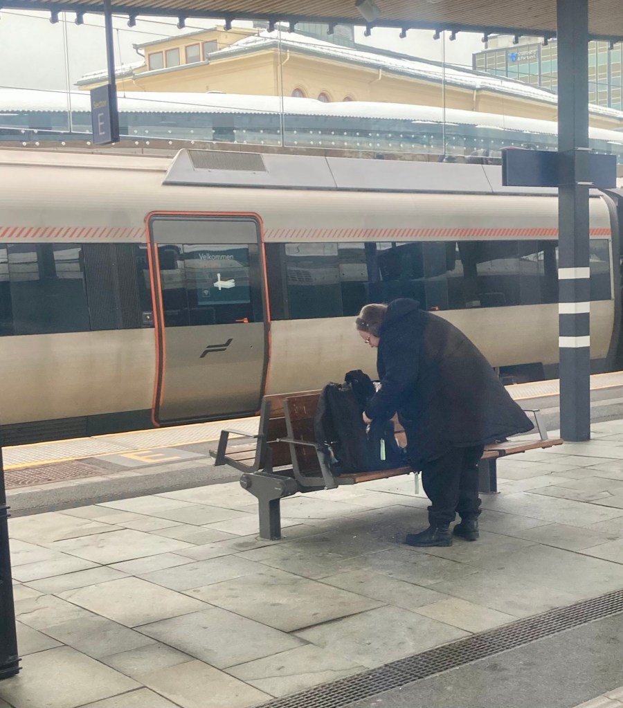 Han gillar att resa själv. Eller för sig själv som man kanske ännu bör säga för att bli förstådd i svenskfinland. Ensam kanske? Allena bland folk. På väg till barn och barnbarn i Norge. Flyg från Finland för att det är hutlöst billigt och behändigt. Tyvärr. Tåg och båt blir betydligt dyrare och mera tidskrävande. Men tåg från flygfältet, lufthamnen, får det ändå bli.