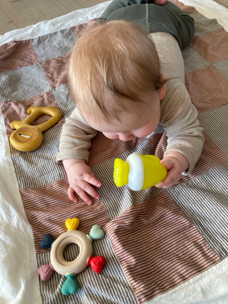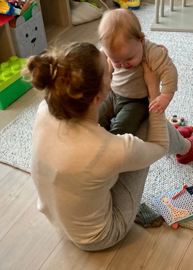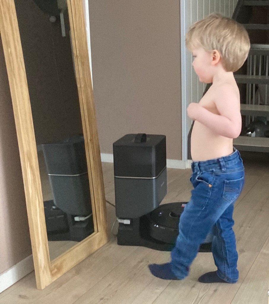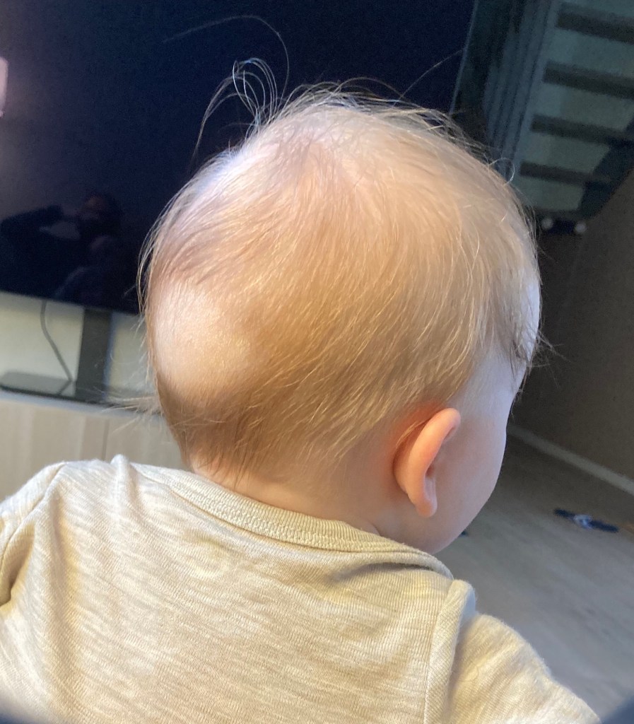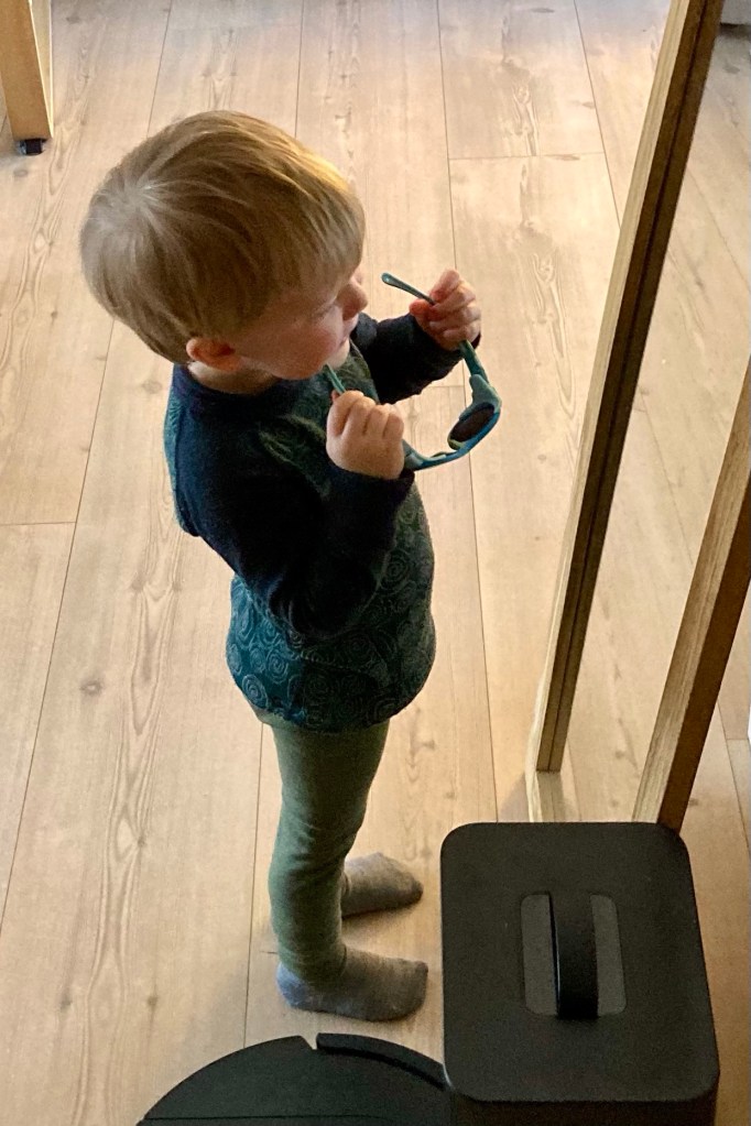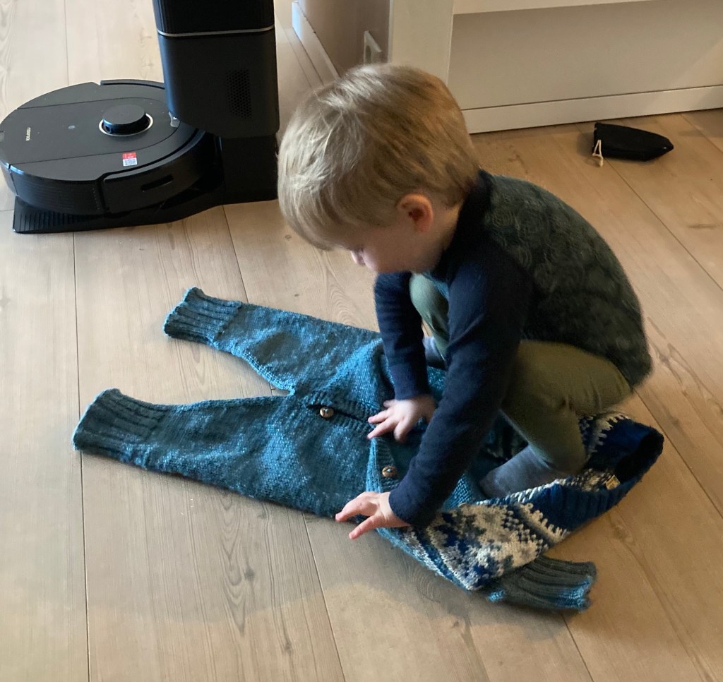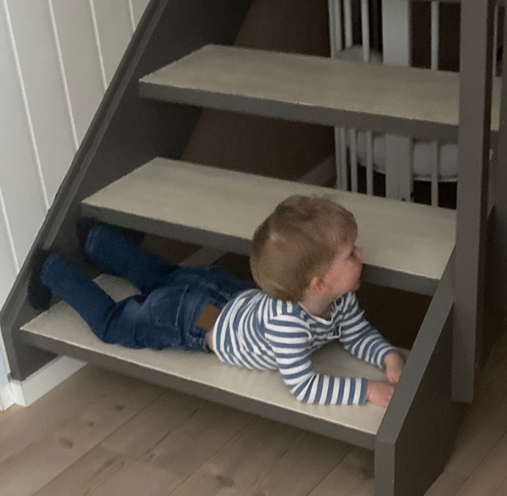 Väl framme blir han hjärtligt mottagen och får följa med till barnahagen efter det äldre barnbarnet. Han konstaterar att också den yngre som hunnit bli ett halvt år har vuxit sedan senast och börjar krypa omkring på golvet. Snart är alla lösa föremål i fara!