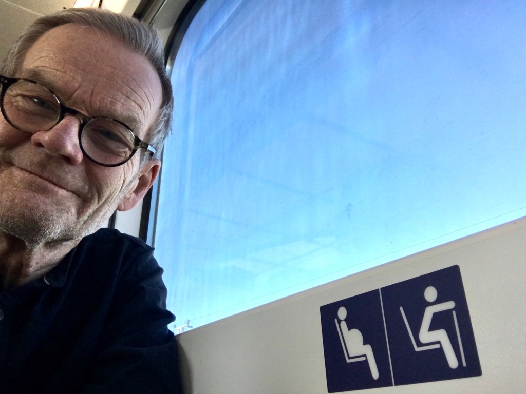 Tågbyte i Östermyra. En timmes väntan i det nya fräscha stationshuset. Läser nyheter om världens (Trumps) galenskap och löser kryss. I tåget från Östermyra till Rovaniemi får han skidorna i cykelställningen och väskan på bagagehyllan. Han börjar lära sig,