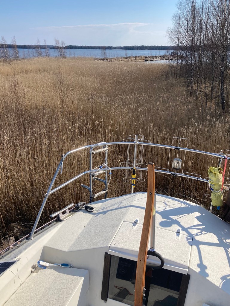 Han börjar med att måla kölen och rodret med den äldsta färgen. Den verkar ha en grågrön schattering. Därpå blandar han alla påbörjade burkar i den stora burken och målar resten med den färgen. Han tycker inte det blir så tokigt. Den burk han köpte på Motonet blir oanvänd. Både Markus och Pekka kommenterar att det finns mindre gift i vit bottenfärg. Han svarar att den här färgen ju är grå.