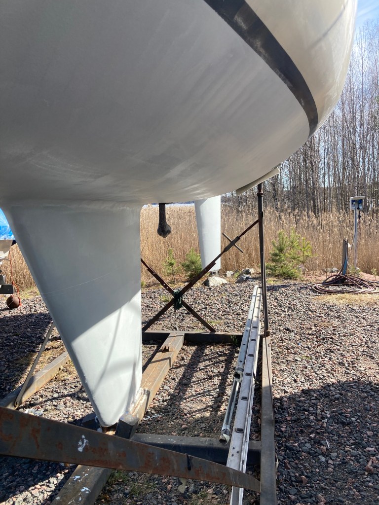 Håkke har hittat en stor burk med gammal grå bottenfärg och en mindre med nyare vit antifouling. Själv har han köpt en ny burk med nyansen Dove White, samma som han använde senaste år före grundstötningen. Härutöver finns det en påbörjad burk med samma duvnyans i hans färglåda.