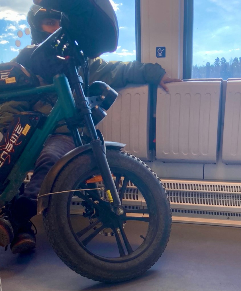 Voltbuden ockuperar numera utrymmet för cyklar och barnvagnar i tågen. Deras cyklar är stora som motorcyklar. En kväll var de fyra i samma tåg.
