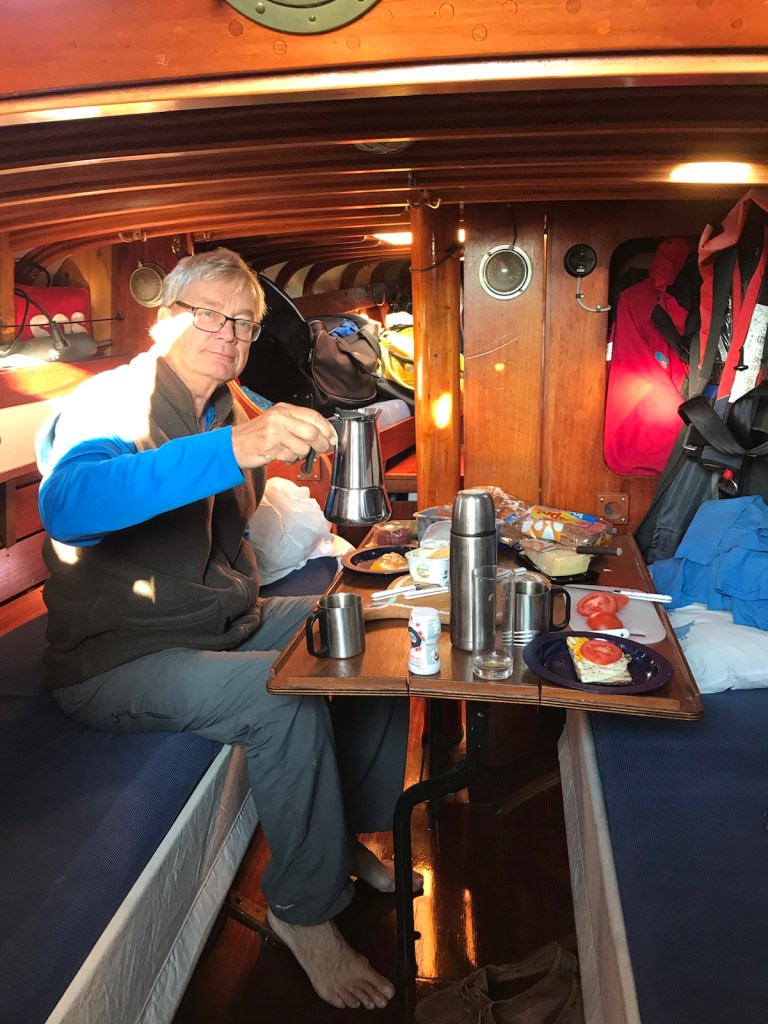 Freja förd till Vasa av Tuomas & co. Skepparen och Jukka kommer dit.Allt går fort, hinner inte med Motvind utlovas hela veckanOm man är flere finns ingen tid för reflektion..Men vi når Molpe hällarna. Denna gång. Och en ny espressokokare har förärats FrejaMolpehällarna – inte vad det en gång varit..Den Österbottniska skärgården – sten på stenGott om utrymme Rätt så lugntKaskö revisitedFreja från olika vinklar – foto Hannu Antilas drönareDet närmaste vi kom Höga KustenJukkas namnsdagskaffeDen ultimata gästhamnen: Kasala fiskelägeFull service: el, bastu, kök, färsk fisk..Vind- dagens temaRäfsö gästhamn efter två årKocken i full gång..